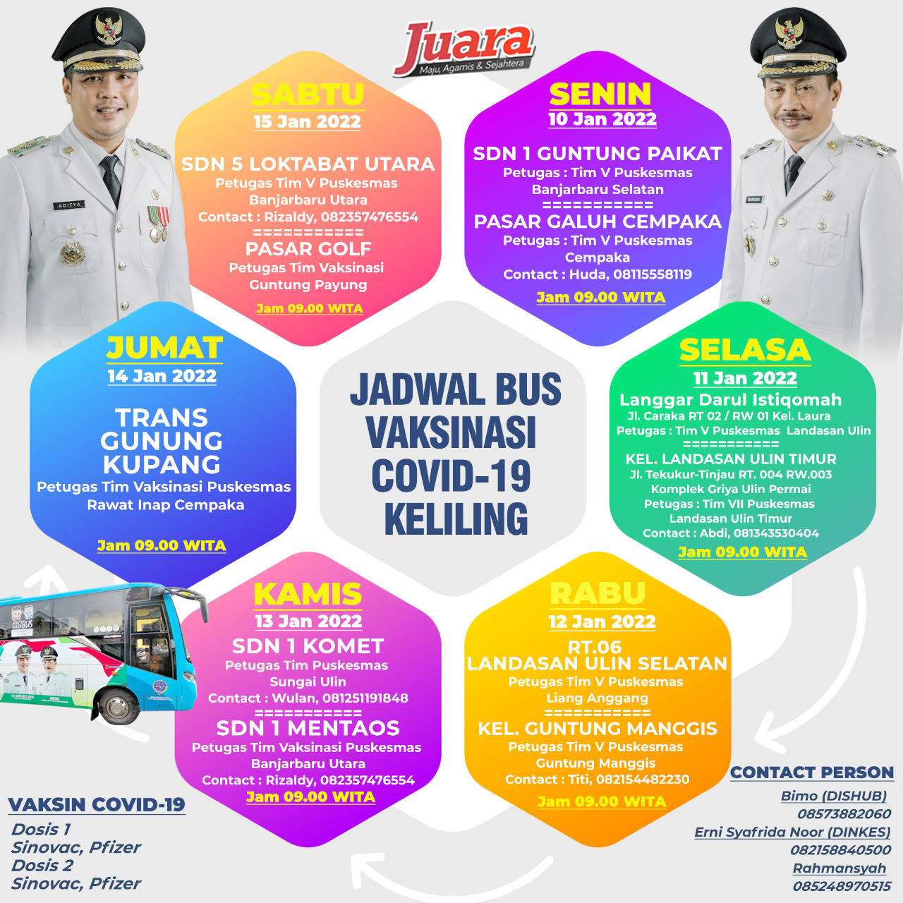 Info GrafisJadwal Bus Vaksinasi 10 – 15 Januari 2022440 by mcbjb10 January 202210 January 2022 Baca Juga:TNI AD Berkolaborasi dengan Pemko Banjarbaru untuk Tingkatkan Produksi Pertanian