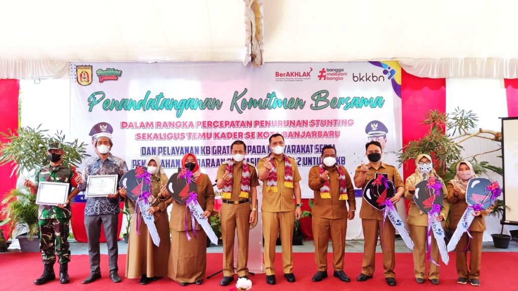 MEDIA CENTER BANJARBARU – Pemerintah Kota Banjarbaru terus melakukan upaya untuk menurunkan dan pencegahan terhadap Stunting, salah satu upayanya yaitu menyelenggarakan Penandatanganan Komitmen Bersama dalam rangka Percepatan Penurunan Stunting sekaligus Temu Kader KB se-Kota Banjarbaru, dan Pelayanan KB Gratis untuk Masyarakat Kota Banjarbaru serta Penyerahan Kendaraan Operasional Roda 2 untuk Penyuluh Lapangan Keluarga Berencana (PLKB), bertempat di Komplek Wengga Tahap IV RT. 044/RW. 007 Kel. Guntung Manggis Kec. Landasan Ulin Kota Banjarbaru, pada (14/03/2022) Senin pagi.