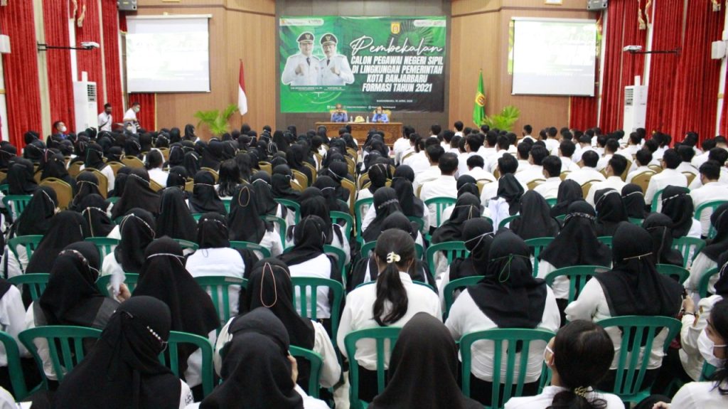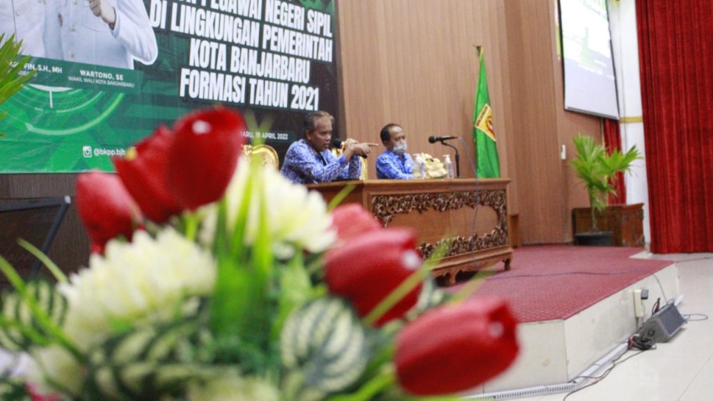 MEDIA CENTER BANJARBARU – Kegiatan Pembekalan Calon Pegawai Negeri Sipil (CPNS) di Lingkunga Pemerintah Kota Banjarbaru Formasi Tahun 2021 dilaksanakan di Aula Gawi Sabarataan Balai Kota Banjarbaru pada Senin (18/04/2022).
