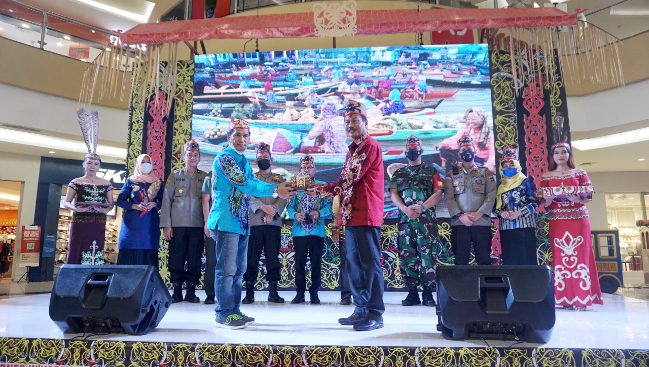 MEDIA CENTER BANJARBARU – Wakil Wali Kota Banjarbaru, Wartono didampingi Kepala Disporabudpar Kota Banjarbaru, Ahmad Yani Makkie secara resmi membuka acara Pagelaran Seni Budaya Dayak Borneo dengan tema ‘Borneo In Harmony 3’, di Atrium Q Mall Banjarbaru, Kamis (12/05/2022).