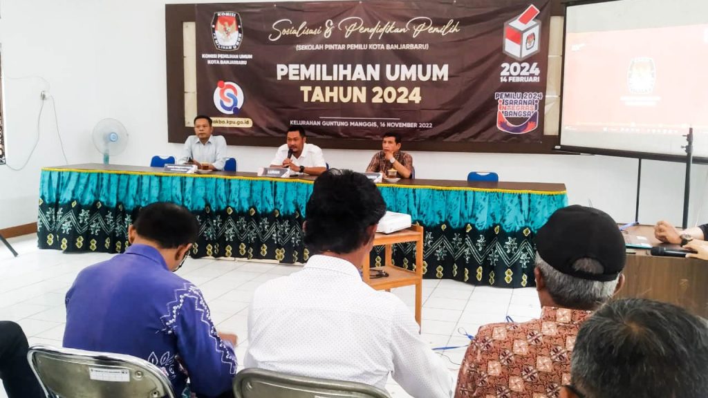 MEDIA CENTER BANJARBARU – Dalam rangka menyukseskan Pemilu Tahun 2024, KPU Kota Banjarbaru menyelenggarakan Sosialisasi Pemilu di Aula Ruhuy Rahayu Kelurahan Guntung Manggis, Kecamatan Landasan Ulin, Kota Banjarbaru, pada Rabu (16/11/2022).