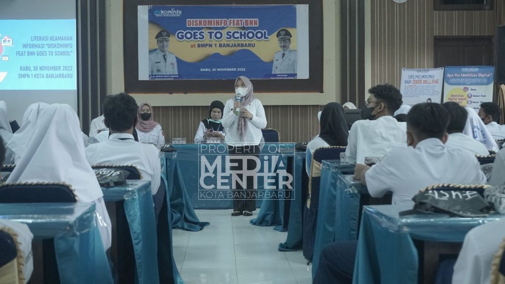 MEDIA CENTER BANJARBARU – Dinas Komunikasi dan Informatika Kota Banjarbaru Bersama Badan Narkotika Nasional Kota Banjarbaru adakan sosialisasi P4GN (Pencegahan dan Pemberantasan Penyalahgunaan dan Peredaran Gelap Narkotika), dan Literasi Keamanan Digital di SMP Negeri 1 Kota Banjarbaru pada Rabu (30/11/2022).