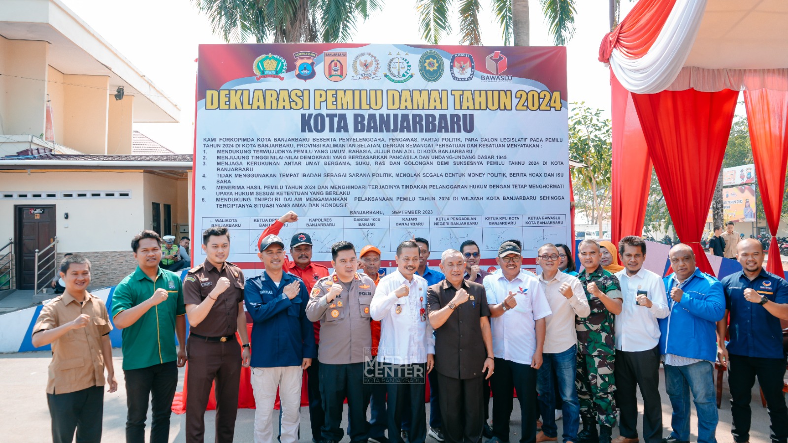 MEDIA CENTER BANJARBARU – Deklarasi Pemilu Damai dihadiri Wakil Walikota Banjarbaru, Unsur Forum Koordinasi Pimpinan Daerah (Forkopimda), KPU, Bawaslu, dan Perwakilan Partai Politik dalam rangka yatakan komitmen bersama dalam menjaga keamanan, kedamaian, serta kelancaran pelaksanaan Pemilu Serentak di tahun 2024, berlokasi di Halaman Hitam Mapolres Banjarbaru pada Rabu (27/09/23).