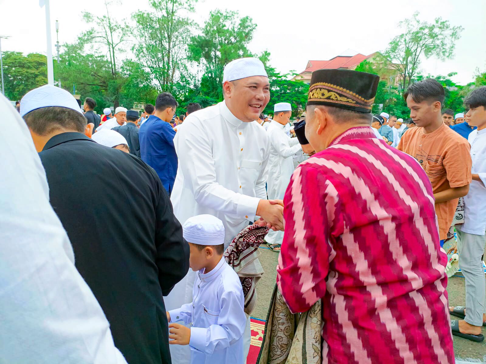 Dalam kesempatan ini, Aditya mengucapkan selamat Idul Fitri 1 Syawal 1445 H, serta menyiratkan doa kepada semua umat Islam agar diberi ampunan setelah menjalankan ibadah puasa selama satu bulan.”Atas nama pribadi, keluarga dan pemerintah saya menyampaikan selamat Idul Fitri 1 Syawal 1445 H Mohon Maaf Lahir dan Bathin, semoga kita mendapat ampunan Allah SWT,” ucapnya dalam sambutan sebelum shalat Ied dimulai.