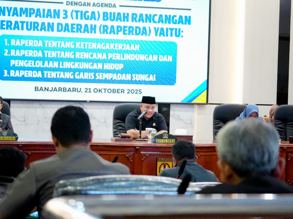 MEDIA CENTER BANJRABARU – Dewan Perwakilan Rakyat Daerah (DPRD) Kota Banjarbaru menggelar Rapat Paripurna dengan agenda Penyampaian Tiga Buah Rancangan Peraturan Daerah (Raperda) yang digelar di Ruang Graha Paripurna Lantai 3, Gedung DPRD Kota Banjarbaru, Senin (21/10/2025).